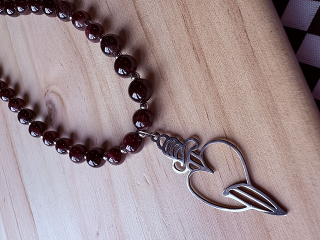 Acero brillante, un corazón valiente y un filo simbólico se unen a un collar de piedras granate que aportan calidez y energía.